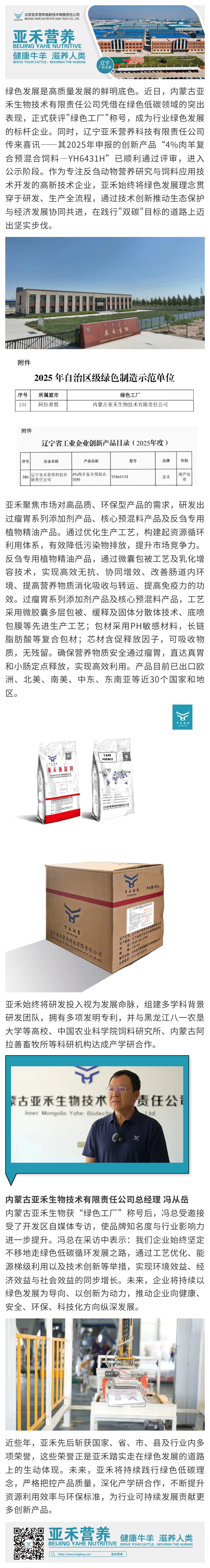 内蒙古亚禾荣获绿色工厂称号 以创新技术引领畜牧业可持续发展